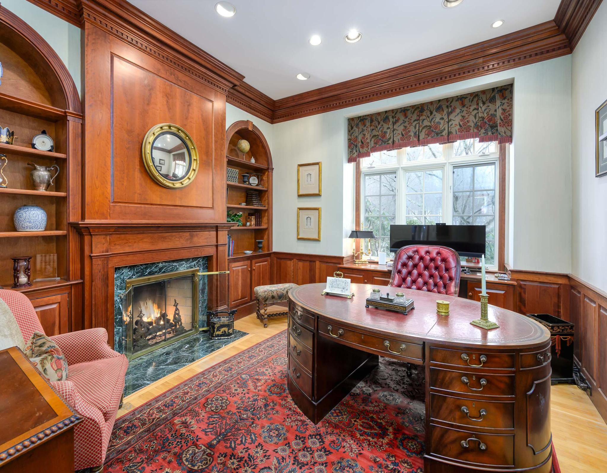 Primary suite with limestone fireplace and custom built-ins