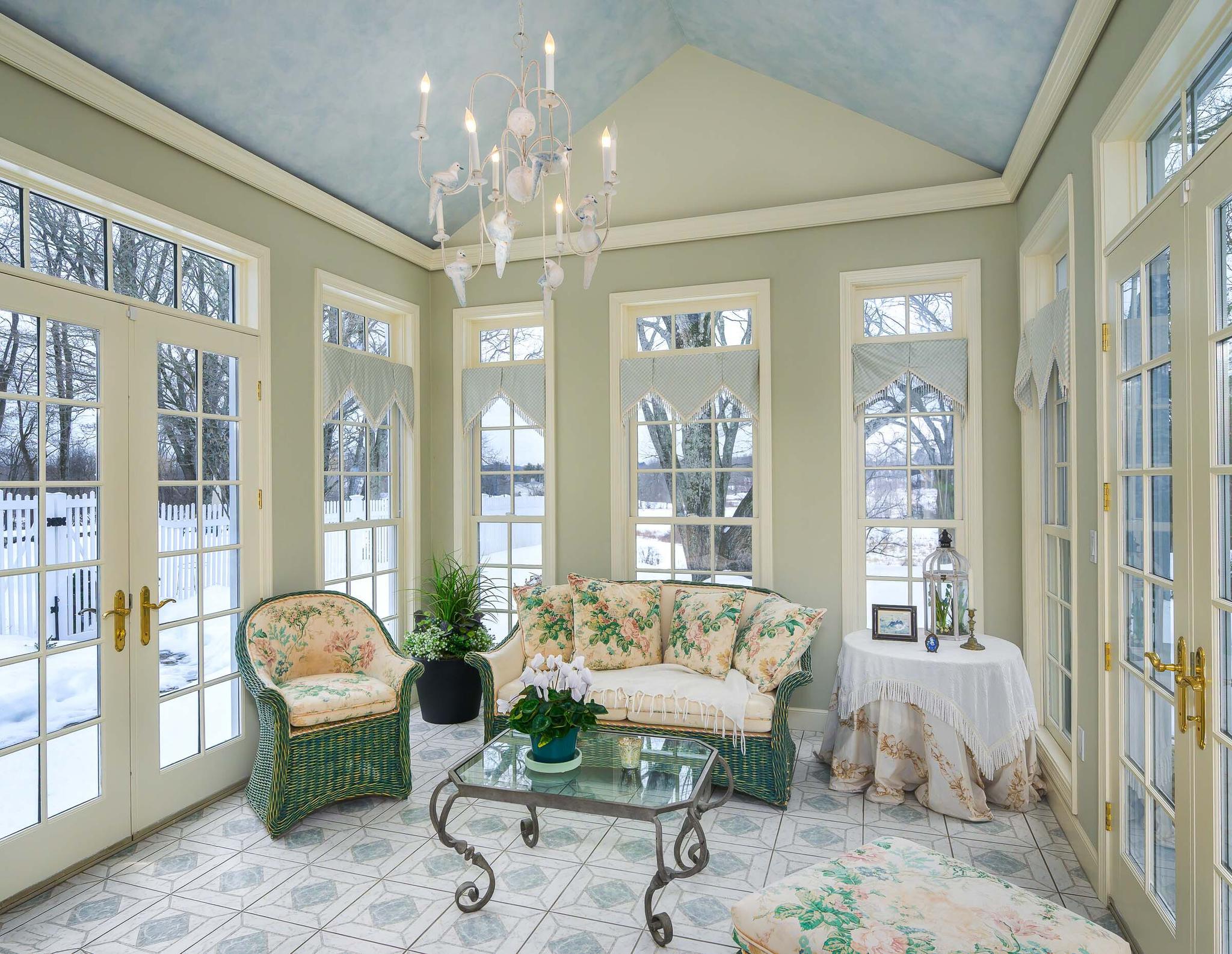 Light-filled sunroom with elliptical windows and French doors