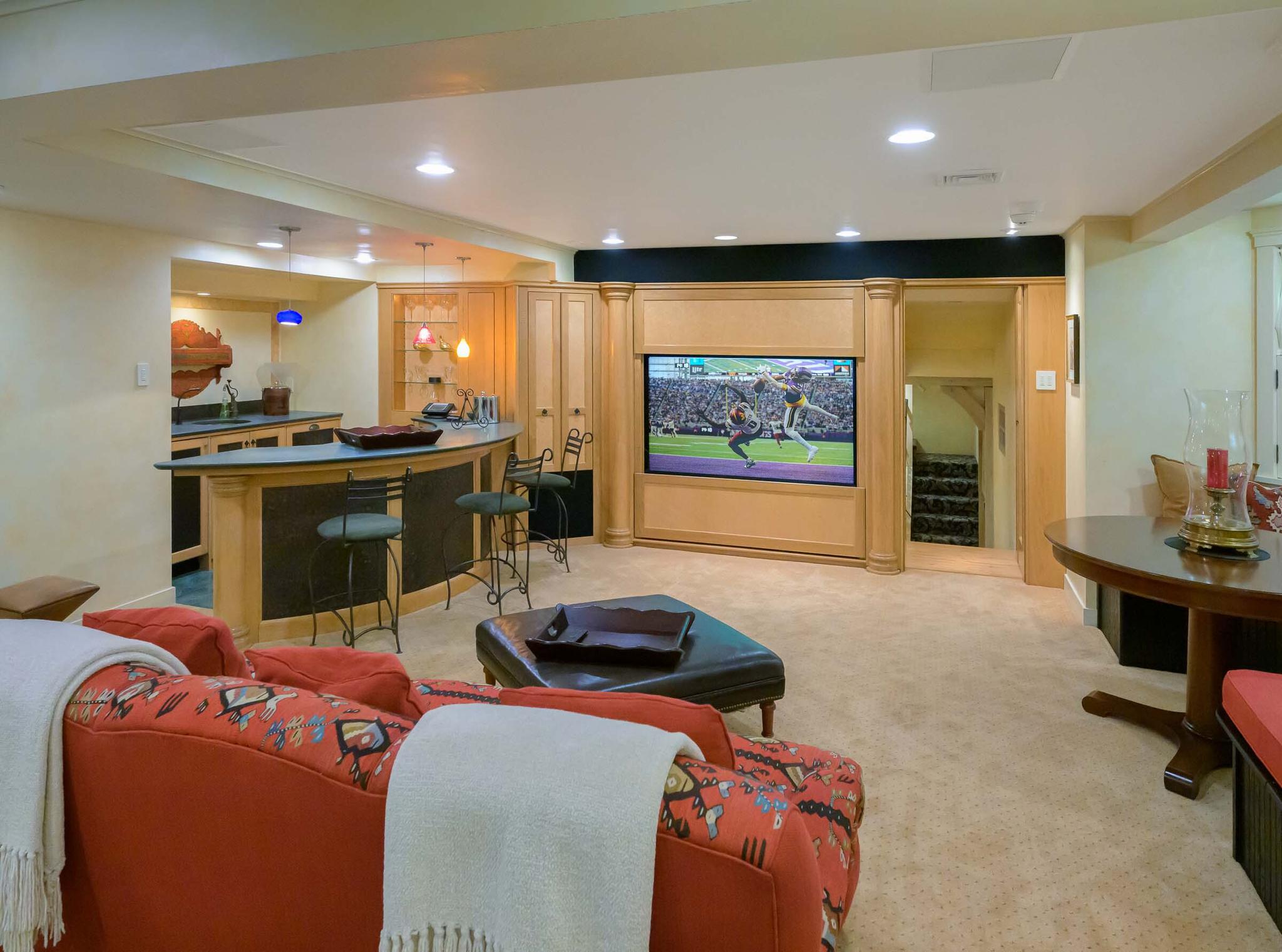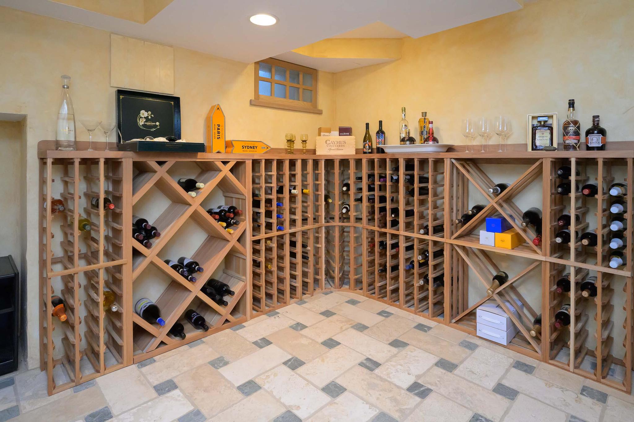 Lower-level billiards room, bar with kitchenette and spacious wine room