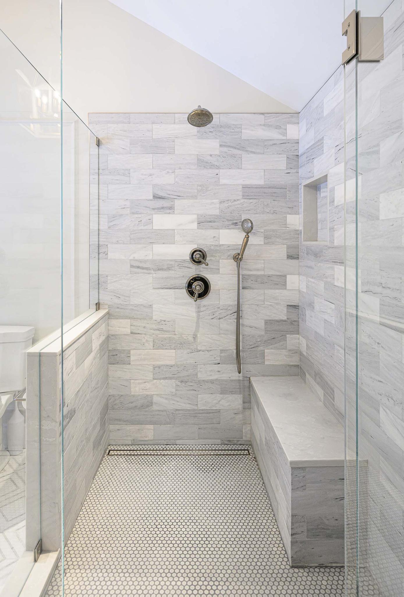 New spa-inspired primary bath with walnut vanities, stunning soaking tub and marble floors